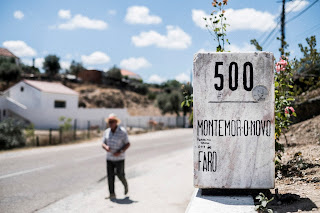Terceiro dia de três do trajeto, a vista alentejana refulgente, os planaltos dourados a vir de frente, a vénia de pinheiros e sobreiros derramados em sombras de asterisco. Num tirinho é o Ciborro, Montemor, quilómetro 500, é ali o café “oficial” da EN2, o café de Ermelinda Miguel, mãe de Jorge Miguel, foi ele que começou há dois anos a divulgar o marco quilométrico 500.